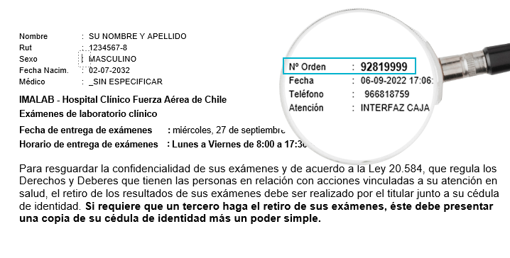 Los resultados únicamente se podrán consultar mediante el uso del número de RUT/ Pasaporte en conjunto con el número de episodio de atención que le será entregado en los módulos de recepción al cancelar los exámenes.